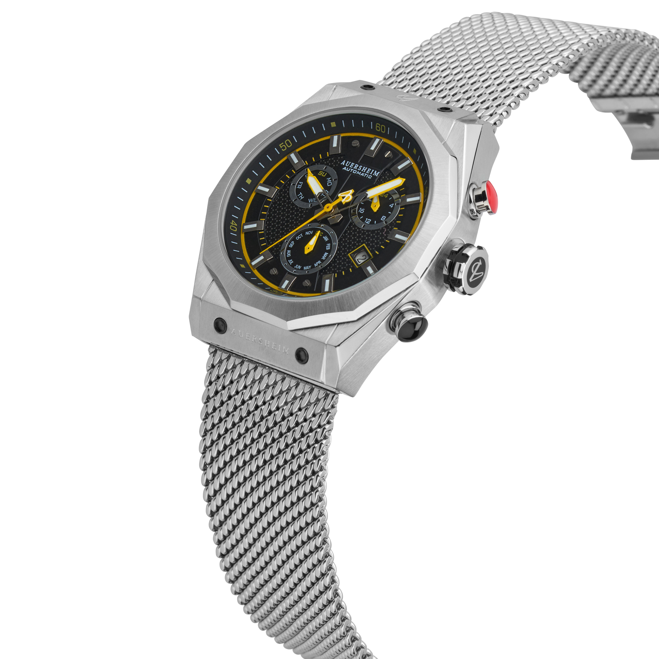 Der mit dem Auersheimlogo verzierte Sekundenzeiger schwebt über den Anzeigen für Datum, Monat und Tag. Die markanten Stundenindizes rahmen das aufwendig verzierte Zifferblatt dynamisch ein.