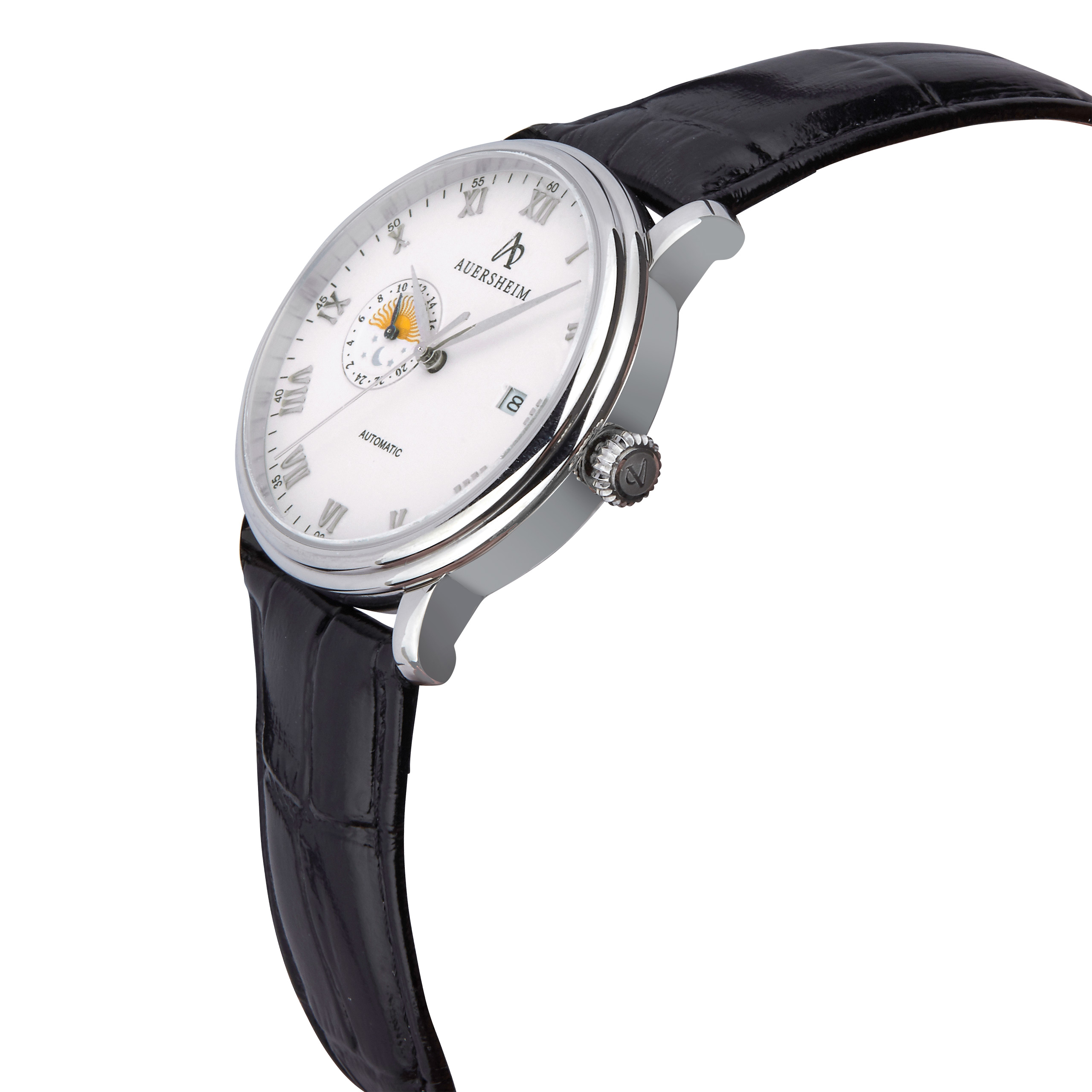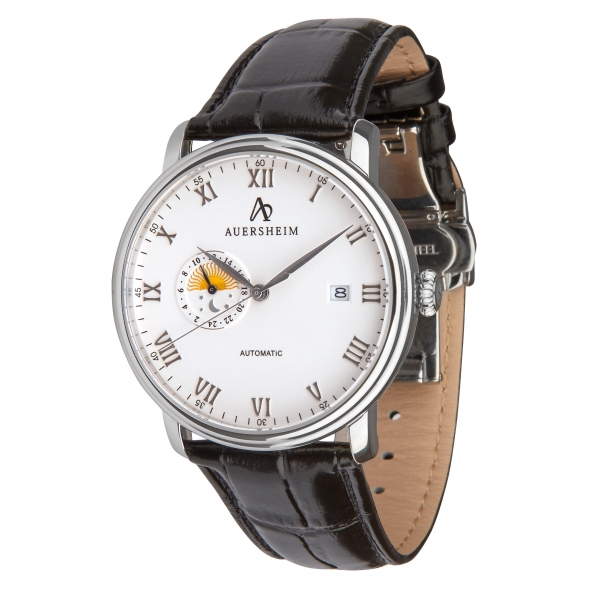 Wie keine andere Multifunktions Uhr von Auersheim verkörpert die Toliman klassisches Uhrendesign mit fortschrittlicher Technik. Das Ziffernblatt mit römischen Indizen führt einen Mondkalender und eine Datumsanzeige. Die schmalen Zeiger und der separate Sekundenzeiger runden den eleganten Stil ab.